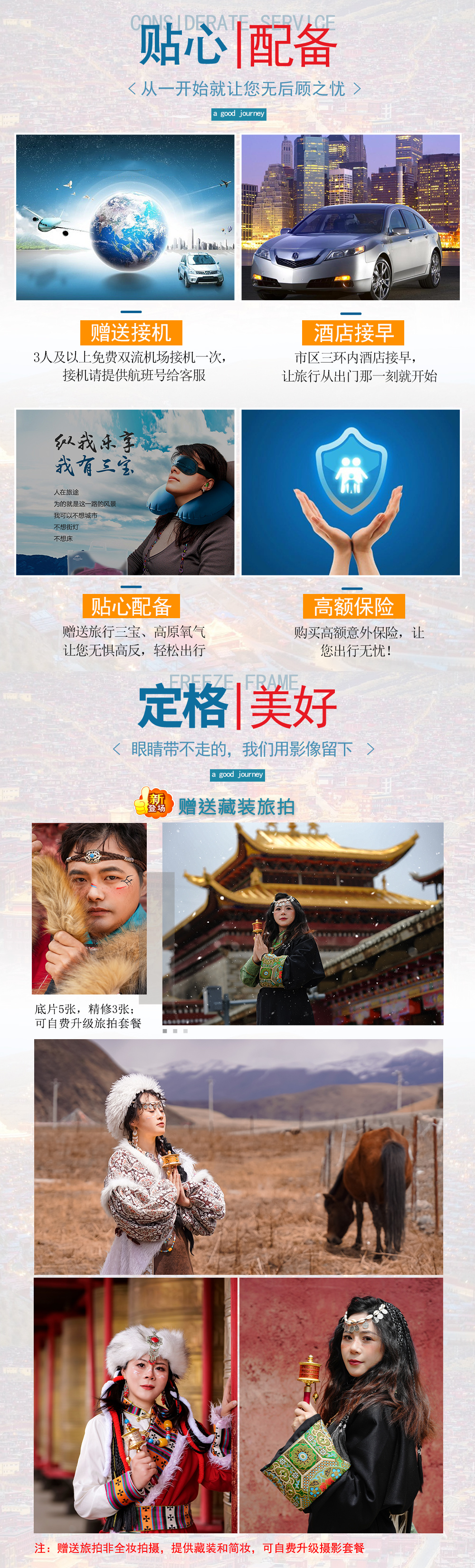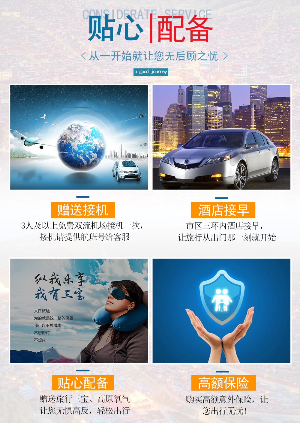 5.其他:赠送旅游意外险50万、旅游三宝、氧气、三环内接早。