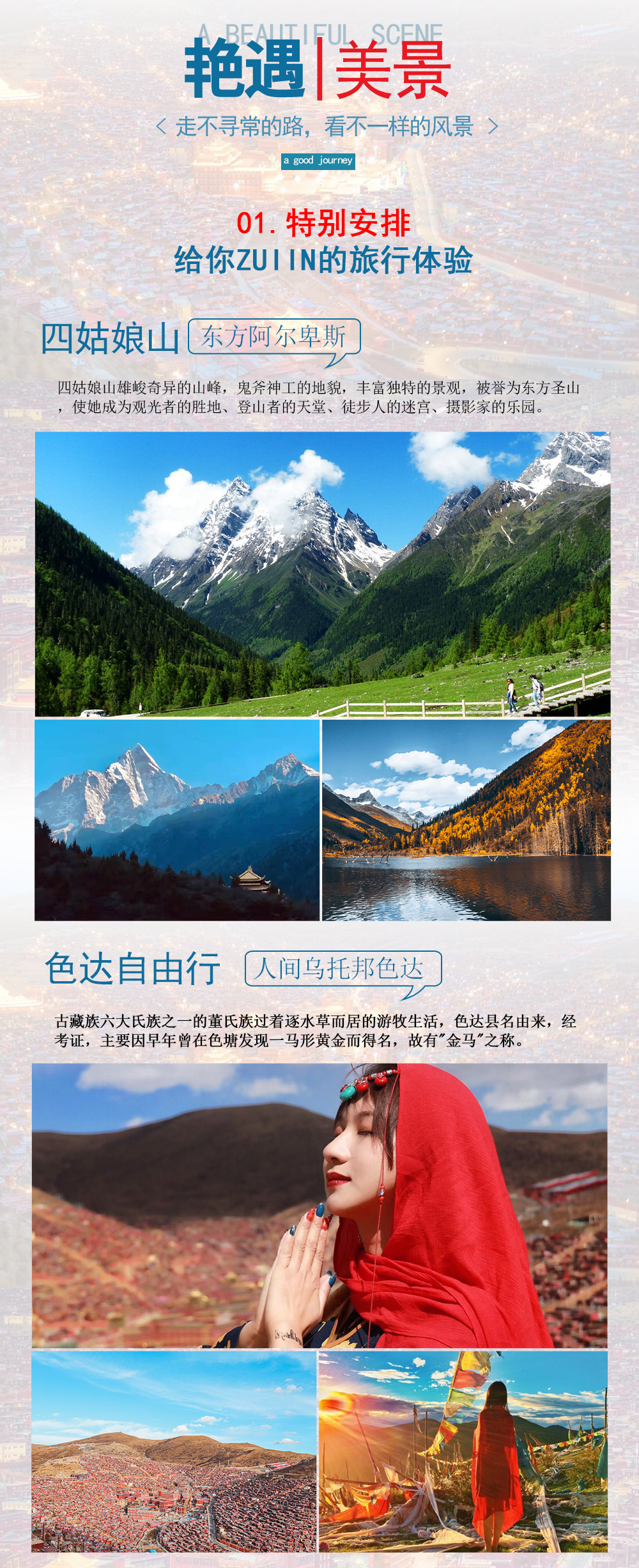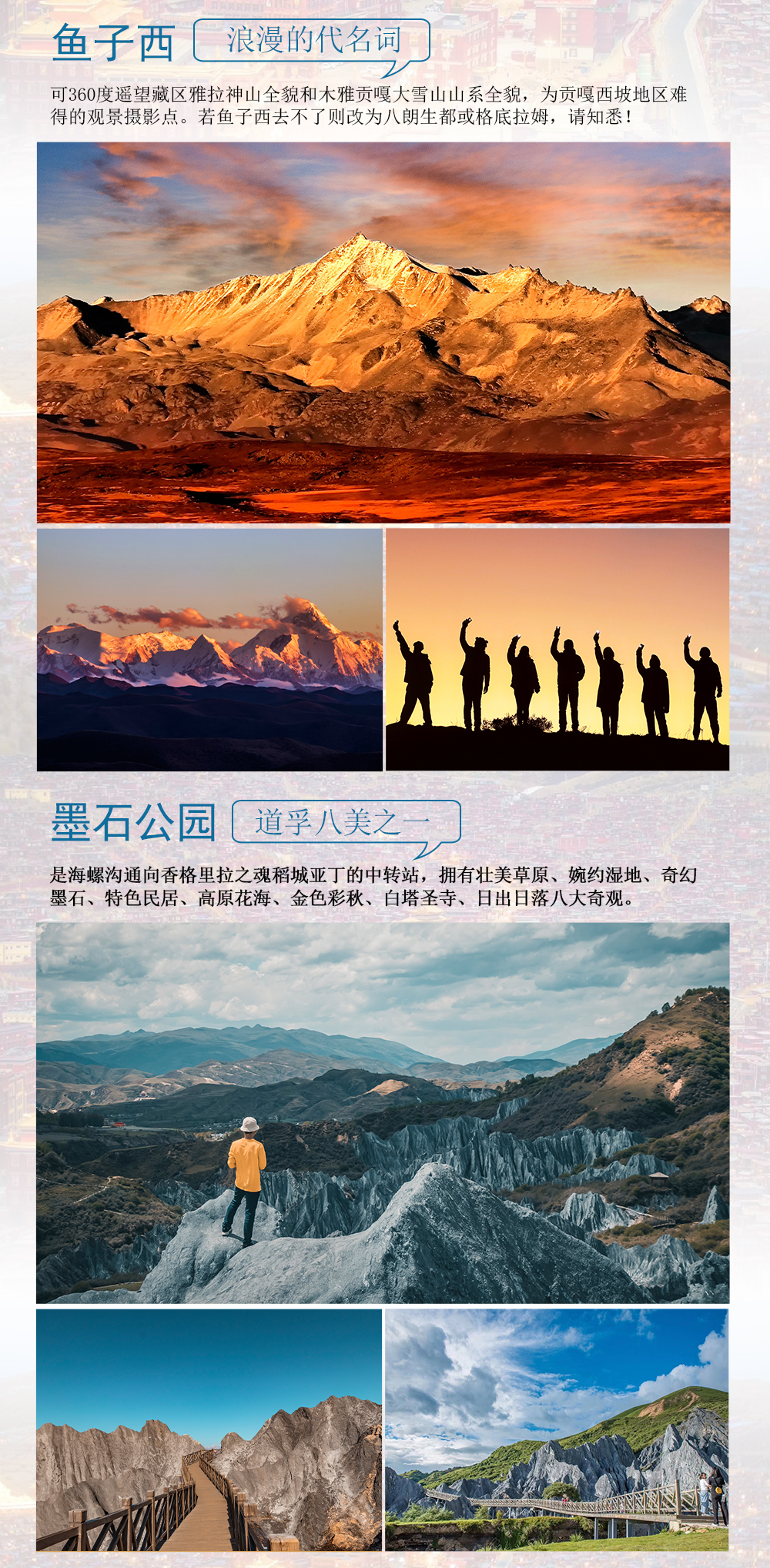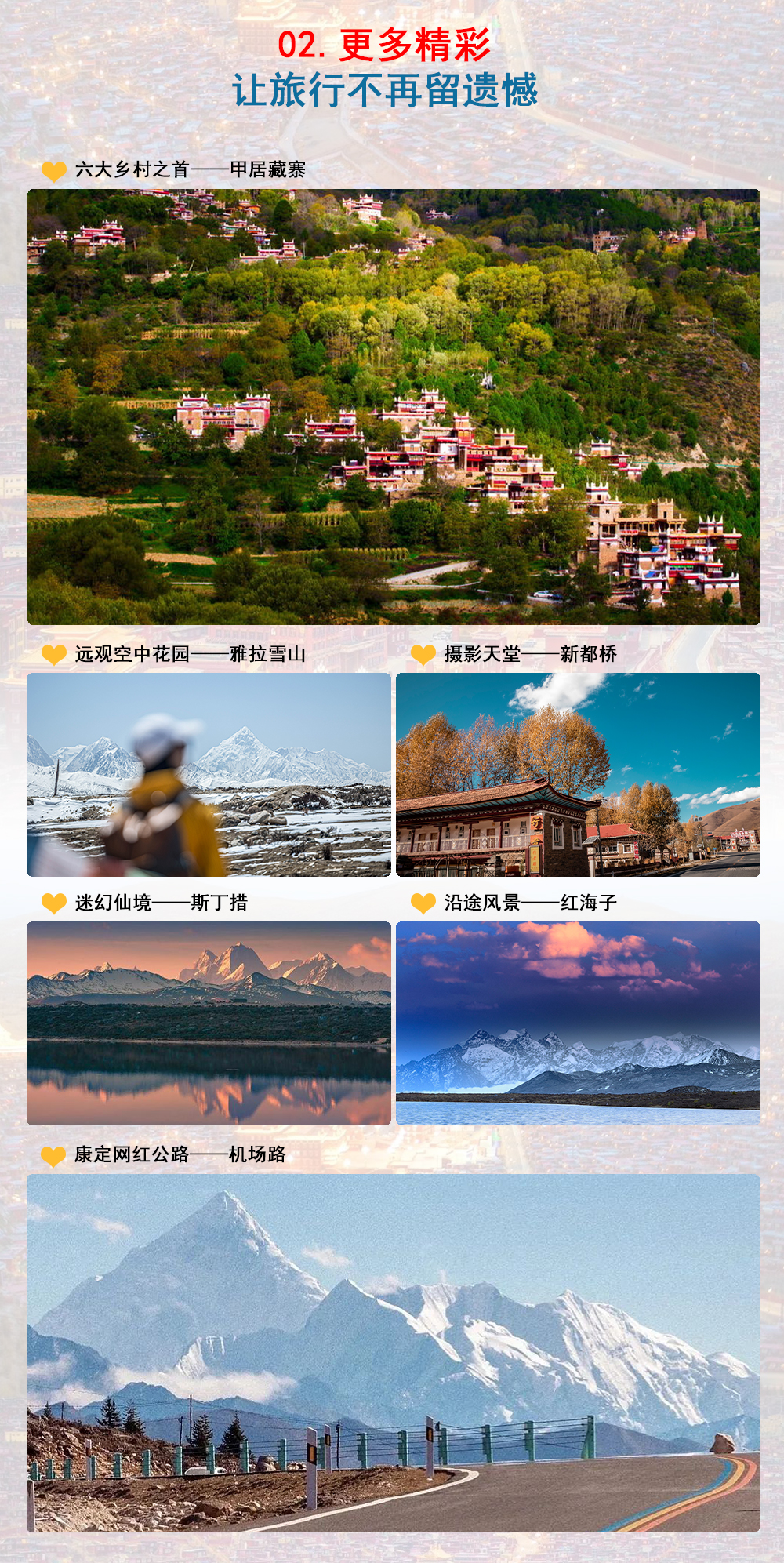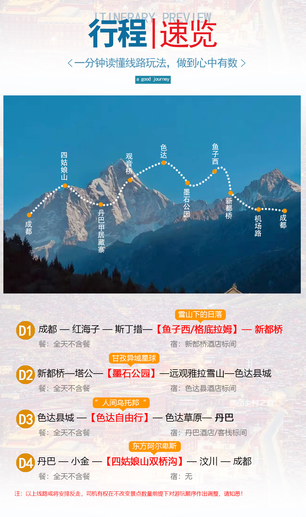 备注:因天气或者道路其他原因,行程游玩顺序可能会根据实际情况改变,所有游玩的景点都不变(如:先到新都桥后四姑娘山、丹巴返回成都)
