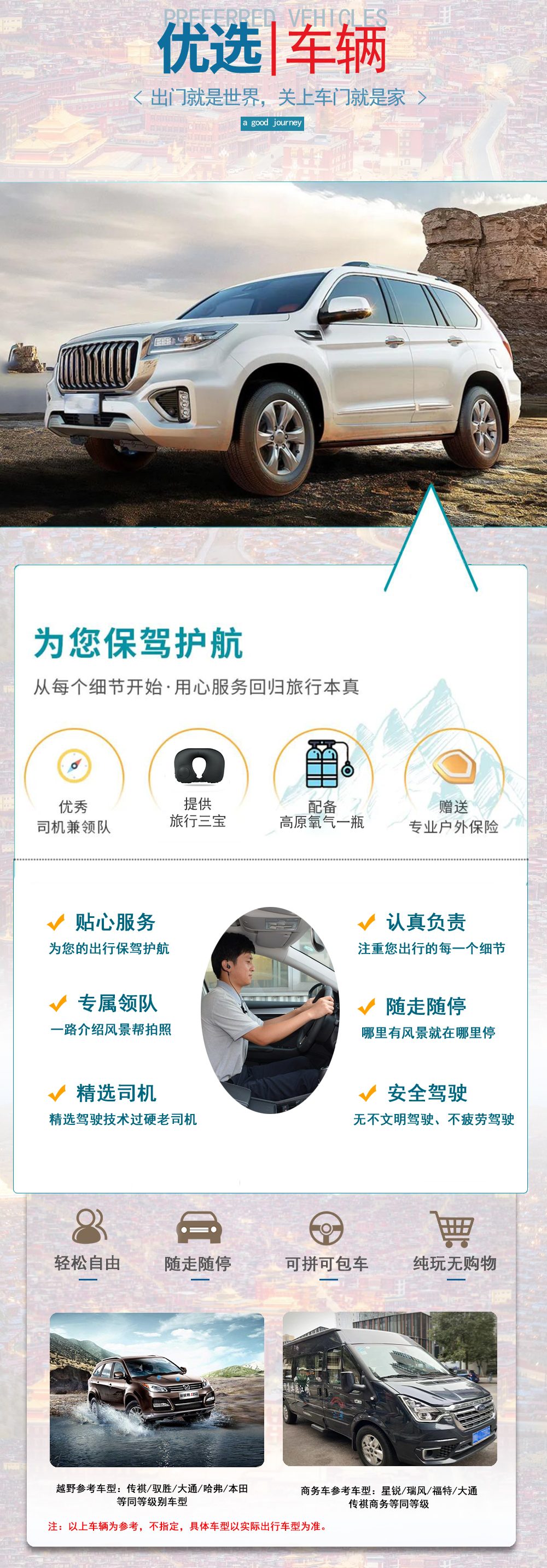 4.领队服务:全程由经验丰富的领队兼司机,驾驶技术好、熟悉路况、沿途景点为您的出游保驾护航!