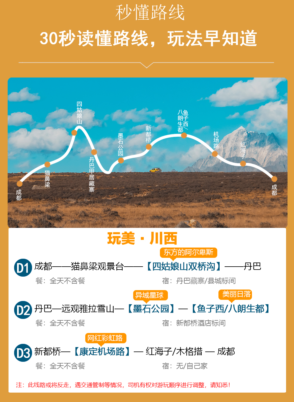 备注:以上行程时间安排可能会因为天气、路况等不可控因素做相应调整,旅行社可根据实际情况,在不减少游览景点的前提下,调整景点先后游览顺序,望知悉;