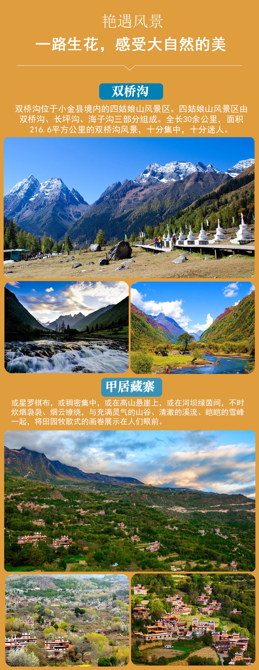 早餐过后7-8点出发(天气原因,出发时间较早,具体时间以领队短信通知为准),成都出发经都汶高速,途经卧龙熊猫谷前往四姑娘山猫鼻梁在猫鼻梁远眺,前面是海子沟,后面是四姑娘山,可观四姑娘山全貌,风景很是震撼;前往四姑娘山镇午餐,随后前往双桥沟景区游玩,【四姑娘山双桥沟】,平均海拔约3500米,游玩时间约3小时,门票参考80元/人+观光车70元/人】沟内主要以雪峰、牧场、草地、森林等为主,沟内山势陡峭曲折,林木葱郁,是四姑娘山美丽的一条沟。漫步沟内,可体验到真正的牧区风光。每当春秋季节,沟内五颜六色,蔚为壮观。沟内有观光车直达沟尾,可以毫不费力,轻松观赏沟内奇景; 游玩过后前往丹巴甲居藏寨,晚上入住丹巴/小金。