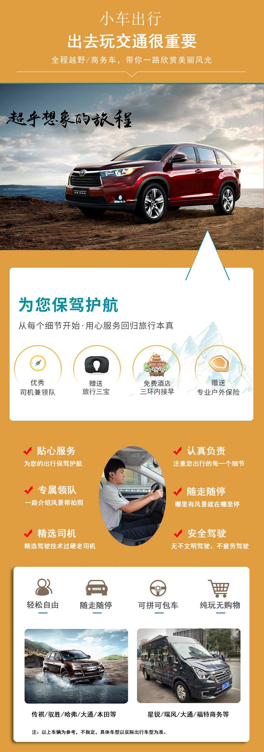 1.车费:3天车费正规用车,跟据人数安排车型5-9座越野或商务;