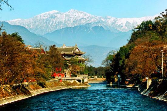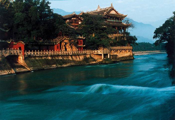 都江堰:位于四川省成都市都江堰市城西,坐落在成都平原西部的岷江上,始建于秦昭王末年,是蜀郡太守李冰父子在前人鳖灵开凿的基础上组织修建的大型水利工程,由分水鱼嘴、飞沙堰、宝瓶口等部分组成,两千多年来一直发挥着防洪灌溉的作用,使成都平原成为水旱从人、沃野千里的"天府之国",至今灌区已达30余县市、面积近千万亩,是全世界迄今为止,年代最久、唯一留存、仍在一直使用、以无坝引水为特征的宏大水利工程,凝聚着中国古代劳动人民勤劳、勇敢、智慧的结晶。