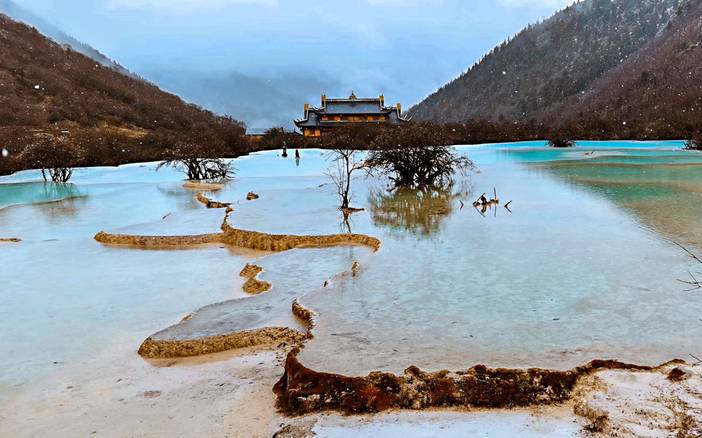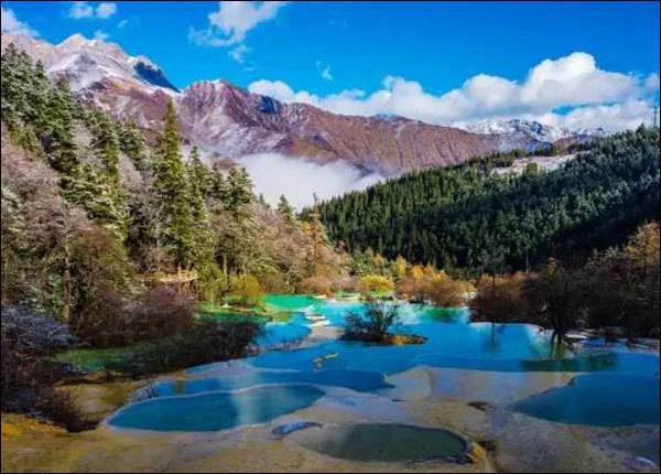 黄龙风景区:位于四川省阿坝藏族羌族自治州松潘县。面积700平方公里。是中国唯一保护完好的高原钙化彩池景观,与九寨沟相距100千米,海拔1700-5588米。黄龙以彩池、雪山、峡谷、森林“四绝”著称于世,再加上滩流、古寺、民俗称为“七绝”。黄龙风景区由黄龙沟、丹云峡、牟尼沟、雪宝鼎、雪山梁、红星岩,西沟等景区组成。行程主要游览景观集中于长约3.6公里的黄龙沟,沟内遍布碳酸钙华沉积。并呈梯田状排列,以丰富的动植物资源享誉人间,享有“世界奇观”、“人间瑶池”等美誉。1992年列入《世界自然遗产名录》。除了高山景观,还可以在这里发现各种不同的森林生态系统,以及石灰岩构造、瀑布和温泉。