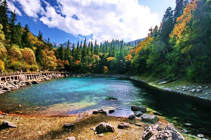 九寨沟风景区:位于四川省阿坝藏族羌族自治州九寨沟县漳扎镇,是白水沟上游白河的支沟,以有九个藏族村寨而得名。九寨沟海拔在2000米以上,遍布原始森林,沟内分布108个湖泊。九寨沟四季景色迷人。动植物资源丰富,种类繁多,原始森林遍布,栖息着大熊猫等十多种稀有和珍贵野生动物。远望雪峰林立,高耸云天,终年白雪皑皑,加上藏家木楼、晾架经幡、栈桥、磨房、传统习俗及神话传说构成的人文景观,被誉为“美丽的童话世界”。九寨沟地处岷山山脉南段尕尔纳峰北麓,是长江水系嘉陵江源头的一条支沟,也是青藏高原向四川盆地过渡的地带,地质结构复杂。这里高差悬殊、气候多样、山明水秀。 九寨沟主沟呈“Y”字形,总长50余公里。沟中分布有多处湖泊、瀑布群和钙华滩流等。水是九寨沟景观的主角。碧绿晶莹的溪水好似项链般穿插于森林与浅滩之间。原始森林覆盖了九寨沟一半以上的面积。林中植物种类繁多,现有天然森林近3万公顷,植物2000余种。多种野生动物繁衍栖息于此,其中包括脊椎动物170种、鸟类141种,属国家保护的有17种。林地上积满厚厚的苔藓,散落着鸟兽的羽毛,充满原始森林的风貌,使人仿佛置身于美妙的世外天地。