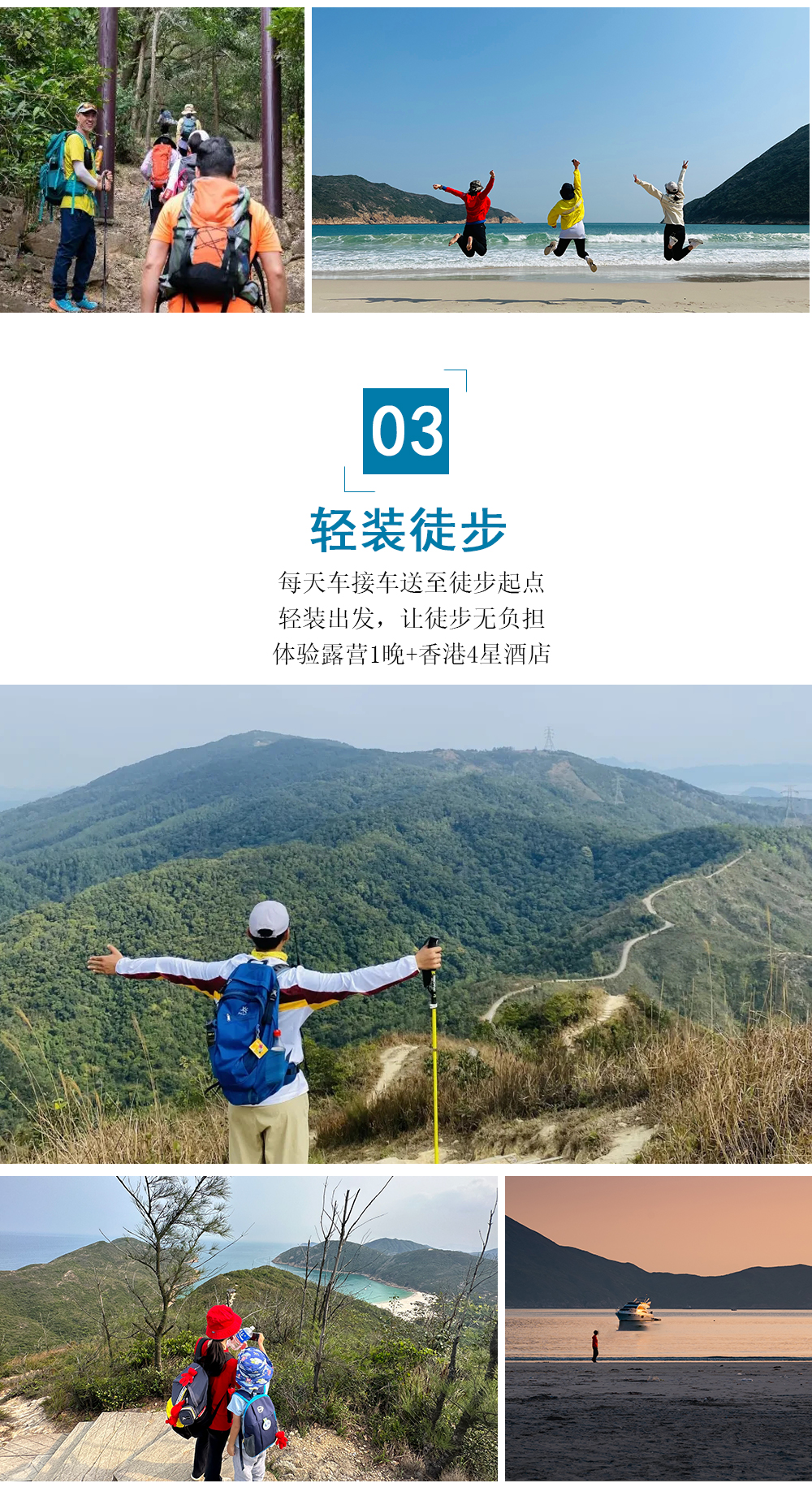 1、住宿:第一晚深圳商务酒店、第二晚咸田湾露营(2人/帐篷、防潮垫)、第三&四&五晚香港四钻酒店,