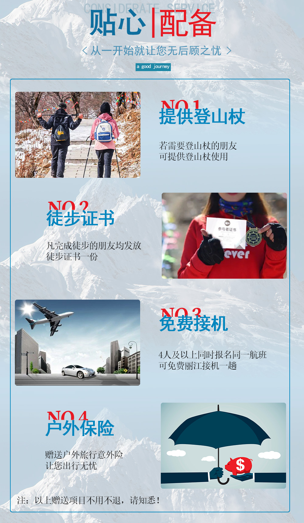 ● 报名活动赠送旅行意外险一份,活动出行期间生效。保险理赔电话:参见保单。