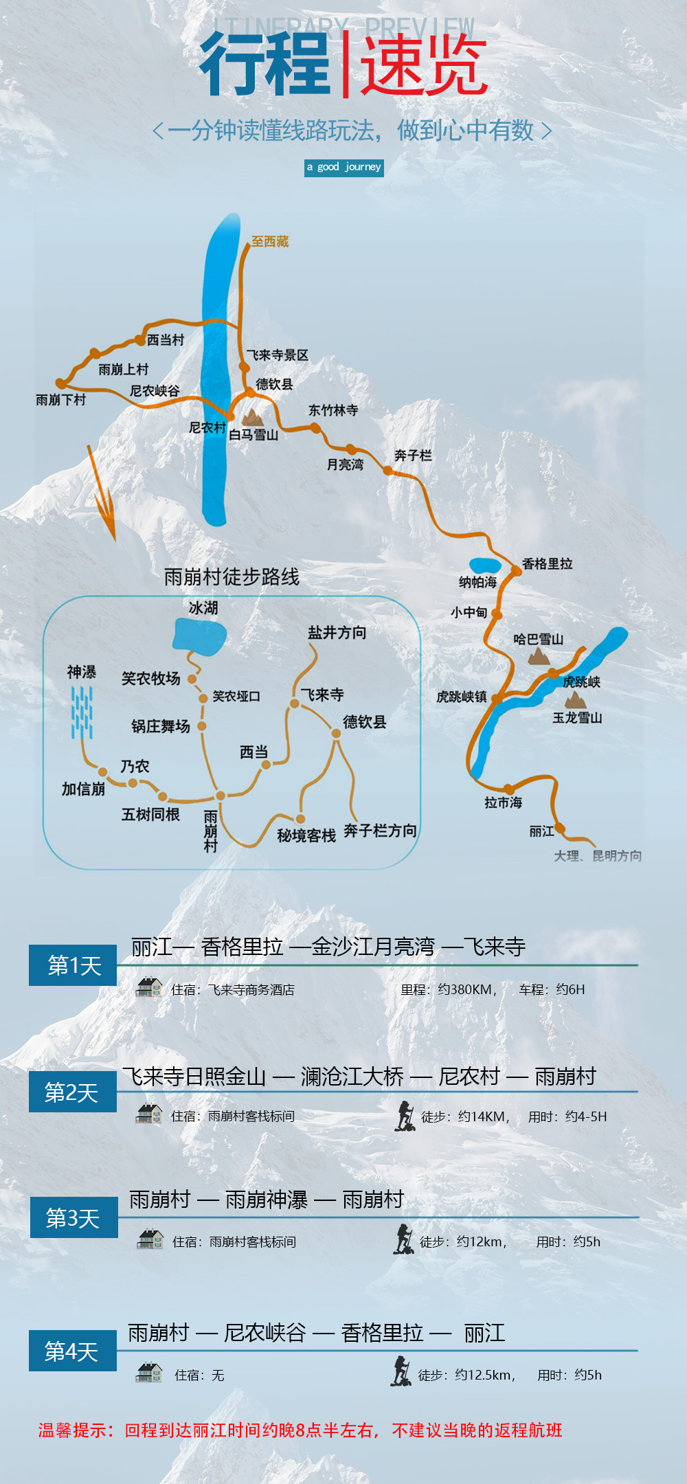 早上 7:30左右起床早餐后与雪山留影之后我们徒步尼龙峡谷走出雨崩村,徒步大概5小时左右(需要跟团师傅一起走西当出雨崩的也可以,因车停在西当)→西当坐车一经香格里拉(大概 18 点左右)→香格里拉高速路回到丽江解散大概 20:30点左右结束愉快徒步雨崩之旅。
