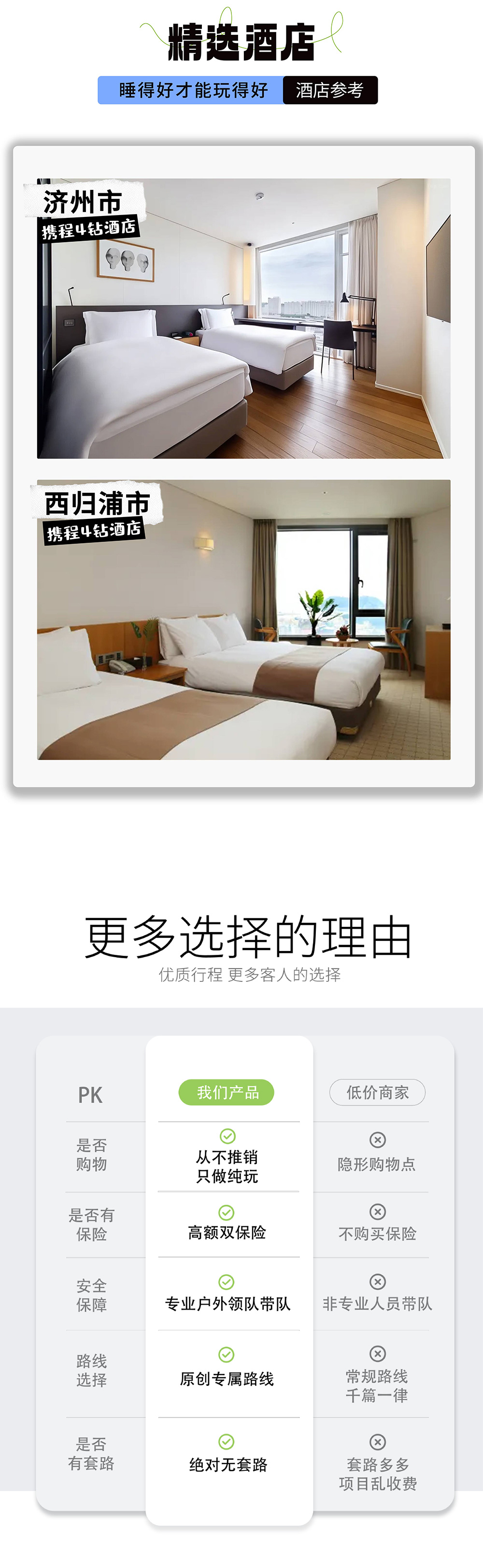 住宿:两晚济州市四钻酒店、两晚西归浦四钻酒店;