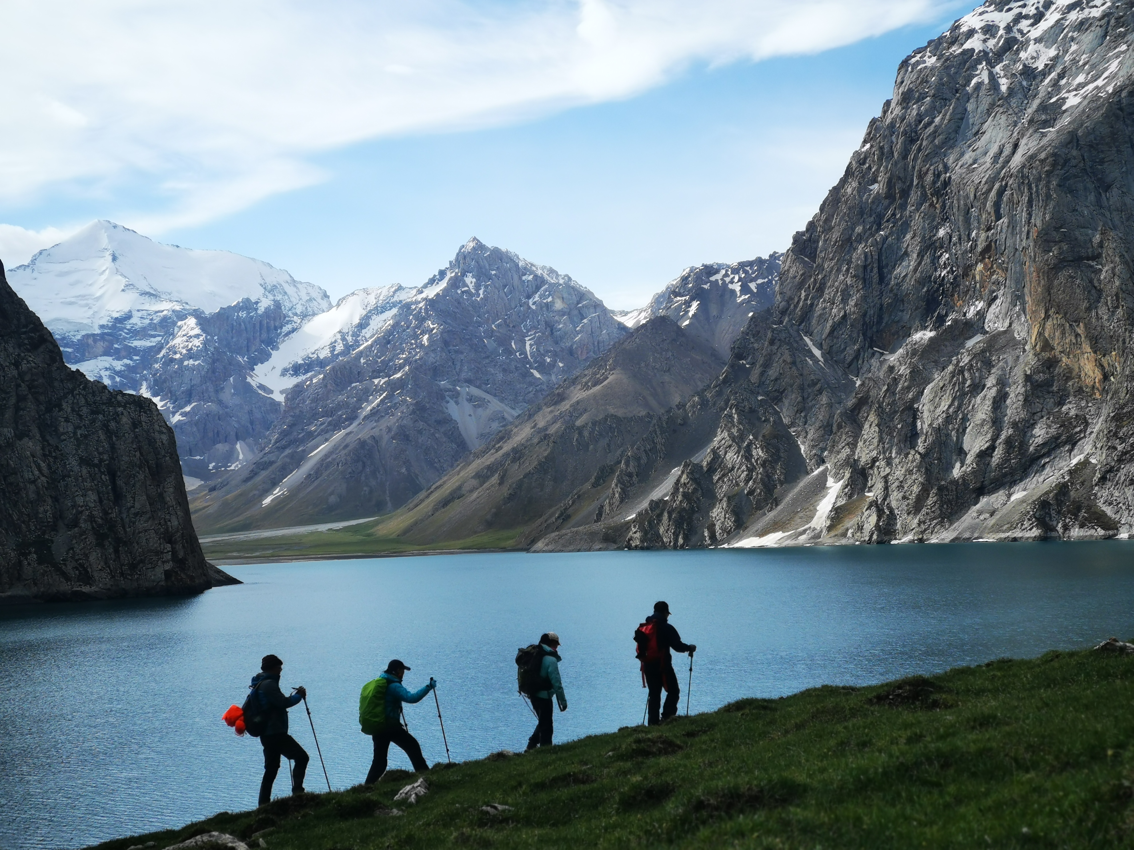 活动说明:早饭过后我们沿着科克苏河南岸的马道向上游而行。前行到科克阿拉皮也沟口,此处较开阔,沿阿克不拉克上行10公里,用时5小时,到达阿克库勒湖边(天堂湖)扎营,海拔3200米,其间要翻一个海拔3400米的小达坂。阿克库勒湖这是一个被雪山包围的湖泊,在巍峨的雪山脚下,碧绿的湖水旁边有着青青的草地,偶尔有哈萨克游牧的羊群或牛群到达这里,外界的一切喧嚣纷杂都跟这里无关,时光仿佛在这里变慢。