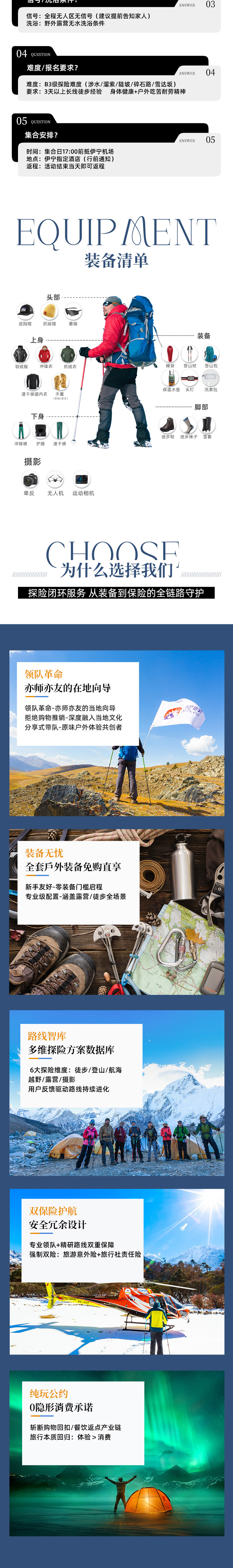 【装备】包含活动所需要公用装备:150L驼包(两人用一个)、毡房、蛋槽防潮垫(一人一个)、营地大帐篷、炊具、桌子、椅子(一人一个)、行程食物、应急装备(卫星电话、对讲机、急救包)、燃料等其他共用装备